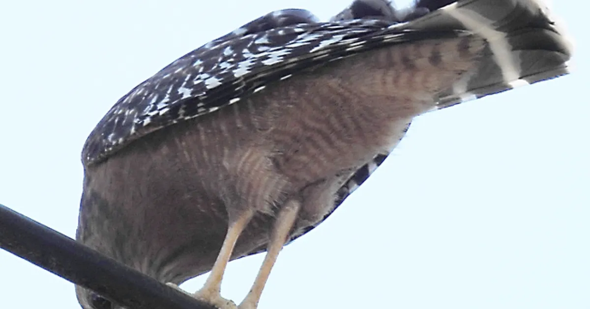 Red-shouldered hawk devouring what appears to be a praying mantis. It caught the insect in the Vacaville Museum and then perched on a telephone line to eat it. (Photo by Kathy Keatley Garvey)