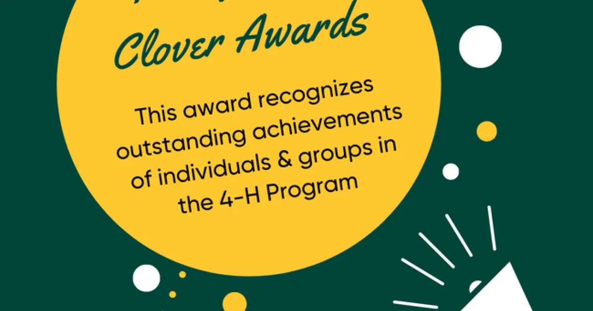 Golden Clover Awards are open to 4-H members, volunteers, groups and staff. Be sure to apply for a Golden Clover Award before September 11th, 2023. There are many types of Golden Clovers you can earn. Learn more about the different awards on our Golden Clover Awards page.