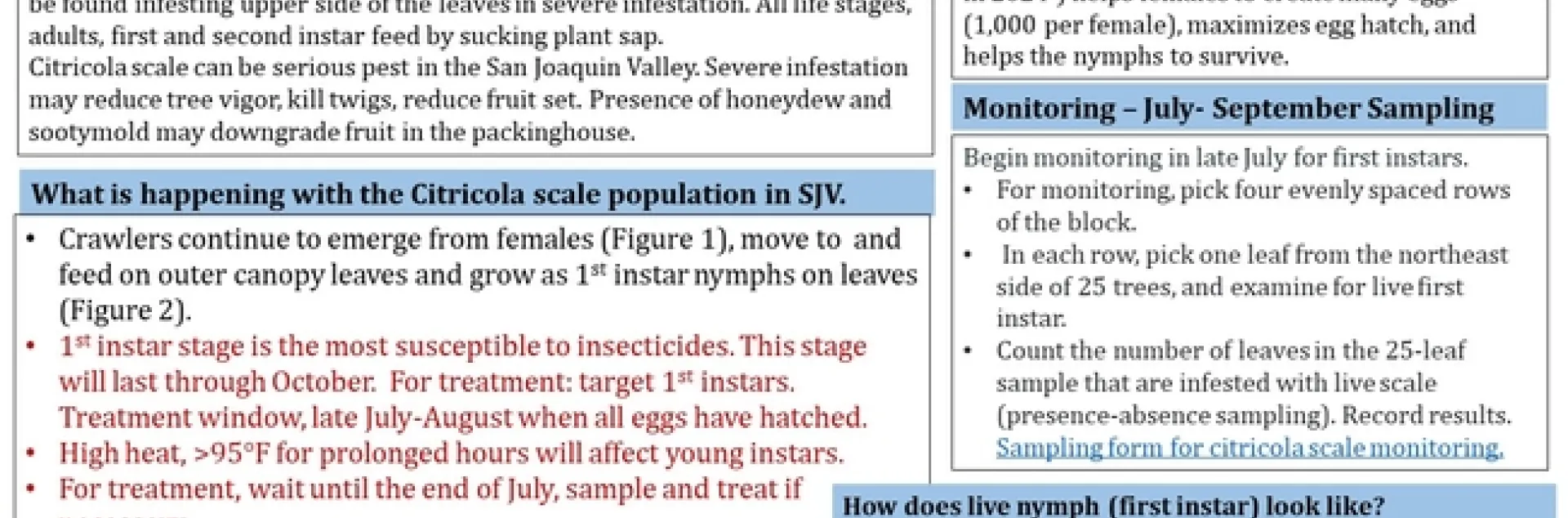 In 2024, there has been an increasing report of significant numbers of citricola scale in the San Joaquin Valley. Damage thresholds are low for citricola scale, 1 adult scale/twig or 0.5 1st instar/leaf. Because this pest produces a large number of eggs (1000/female), populations can build up quickly under right weather conditions. Cooler and wetter weather conditions in April/May meant higher egg hatch and nymph survival increasing the infestation in 2024 season.