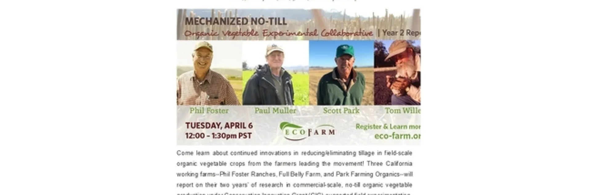 Four California organic farmers, Phil Foster of Hollister, Paul Muller of Guinda, Scott Park of Meridian, and Tom Willey of Madera, will participate in an hour-and-a half online workshop session on April 6, 2021 from 12:00 PM through 1:30 PM about the reduced disturbance work that they are conducting as part of an NRCS CIG project aimed at investigating and refining organic reduced disturbance techniques in California. The workshop will feature a Q & A session that follows a panel presentation that the four farmers made as part of the 2021 ECOFARM Conference in January. The workshop will be moderated by CASI Workgroup member, Dr. Cindy Daley of Chico State. An audio summary introduction to the workshop that ran on Don York's "Ag Report" radio program on KMJ580 on April 6th is linked below.