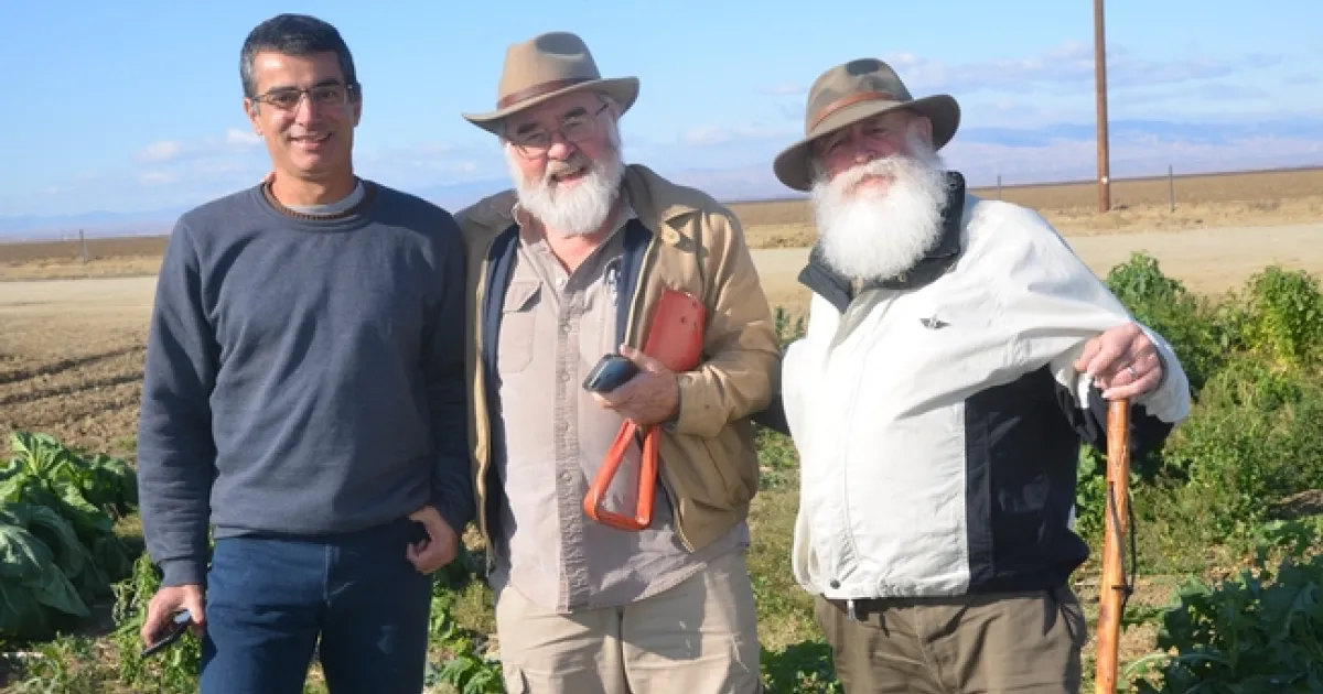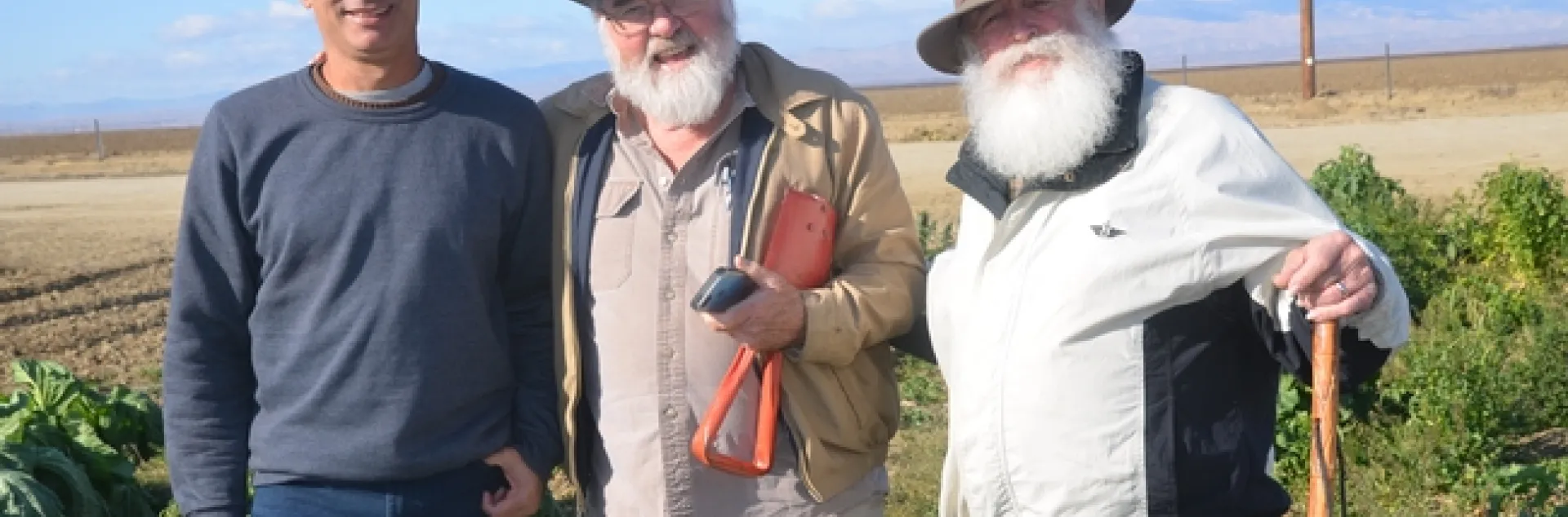 Roberto Botelho, Angus Wright, and Tom Willey (left to right) visit the NRI Project field in Five Points, CA, February 22, 2018