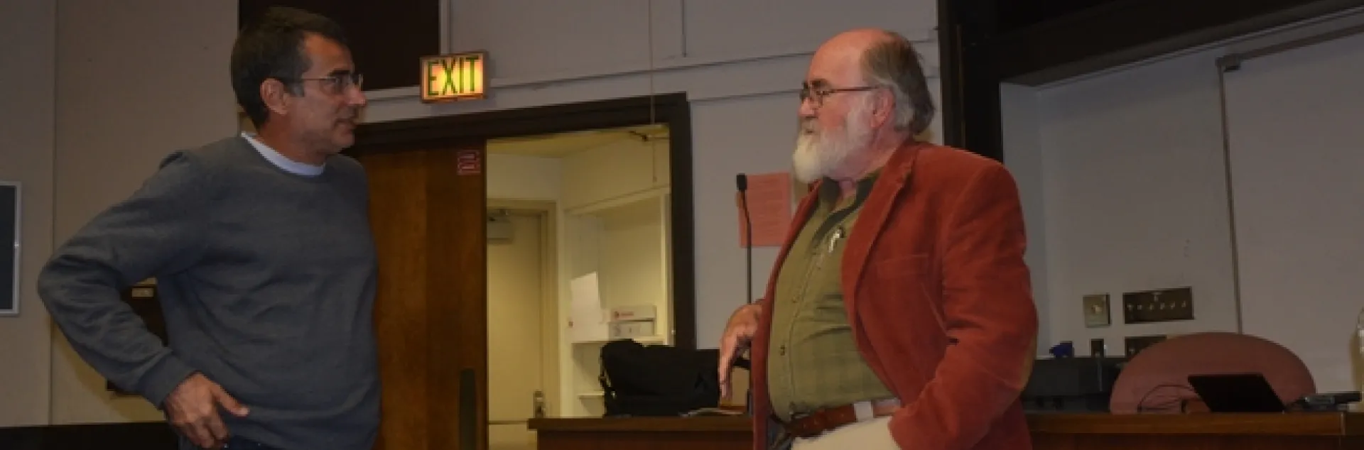 Roberto Botelho (left), Brazilian conservation agriculture researcher from Sao Paolo state and Angus Wright, Emeritus Professor of Environmental Studies at California State University, Sacramento at seminar presentation of Wright at Fresno City College, February 22, 2018