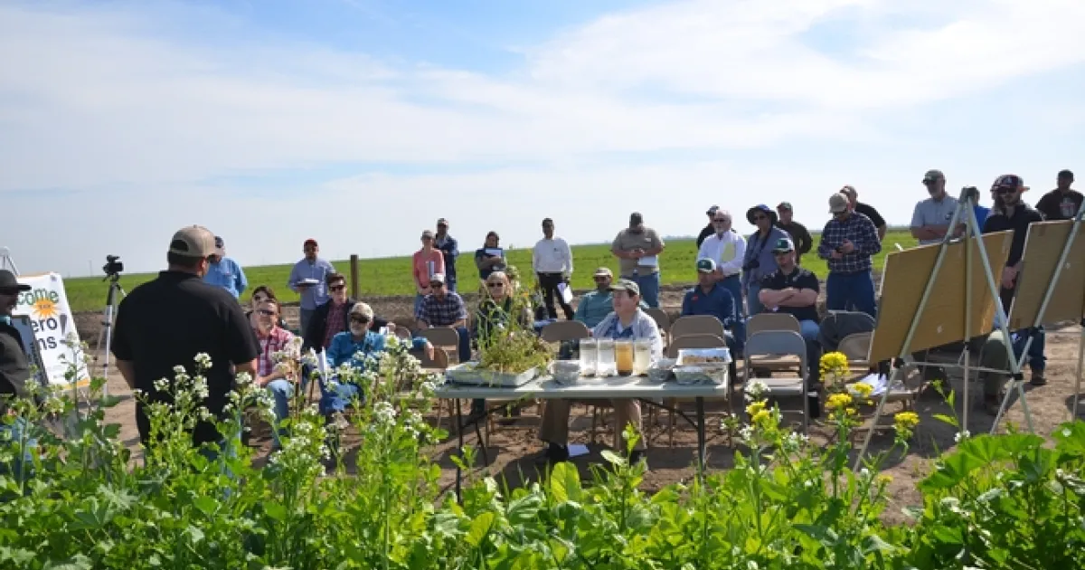 In the field day that they hosted with Jeff Mitchell of the CASI (Conservation Agriculture Systems Innovation) Center at UC Davis, they talked about how they managed their 2015 cover crops and what they are hoping to get from them. Each of the mixtures was drill-seeded last October on the tops of their tomato beds, - not in the furrow bottoms, at rates ranging from 60 to 70 lbs/acre. They sprinkler-irrigated their fields as pre-irrigation ahead of this year's tomato crop and said that they applied only one and a half to two inches of additional water for the cover crops. After chopping and removing the above ground materials for silage that is going to a dairy in the Chowchilla area, they will run a strip-tiller to till the centers of their beds and to apply herbicide, before transplanting tomatoes. Later during the tomato season, they'll shallowly work in the remaining cover crop stubble during one of their weed cultivation operations.