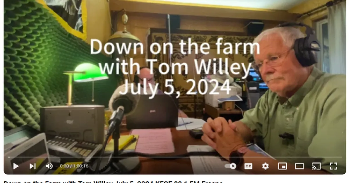 CASI's Jeff Mitchell was a "three-peater" July 5th on Tom Willey's "Down on the farm" radio program on KFCF's 88.1 FM station on July 5, 2024. He shared information from the recently published article, No-tillage, surface residue retention, and cover crops improved San Joaquin Valley soil health in the long term, that was published in the May 2024 issue of California Agriculture. Willey was a co-author on the work and he talked with Mitchell about how the work came about, what its study goals were, how it was conducted, and what its findings were. Willey's program airs every first Friday of the month and has a loyal following that includes a great diversity of folks who greatly enjoy his 'on the front porch' conversations with his guests. A video of the radio interview is available at the You Tube link