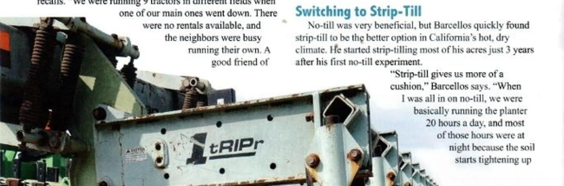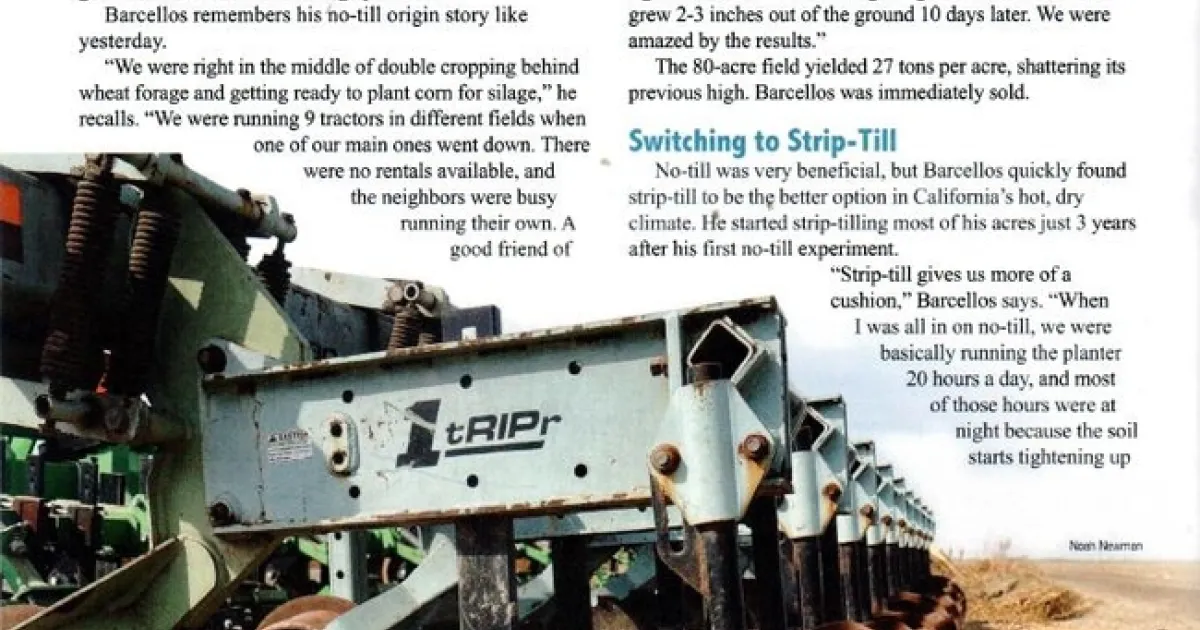 Tipton, CA dairyman and long-time CASI farmer member, Tom Barcellos, was featured in the Winter 2023 issue of Strip-till Farmer, a quarterly publication of the National No-till Farmer Association and Lessiter Publications. The article details Tom's 23-year history as a strip-till trailblazer right here in California's San Joaquin Valley and describes how he came to find how strip-tillage "made everything a lot easier" at his 2,000 cow dairy just east of Highway 99 in Tulare County. The Strip-till Farmer magazine article was written by Noah Newman when he came to California recently to interview Tom. A copy of the article is attached below.