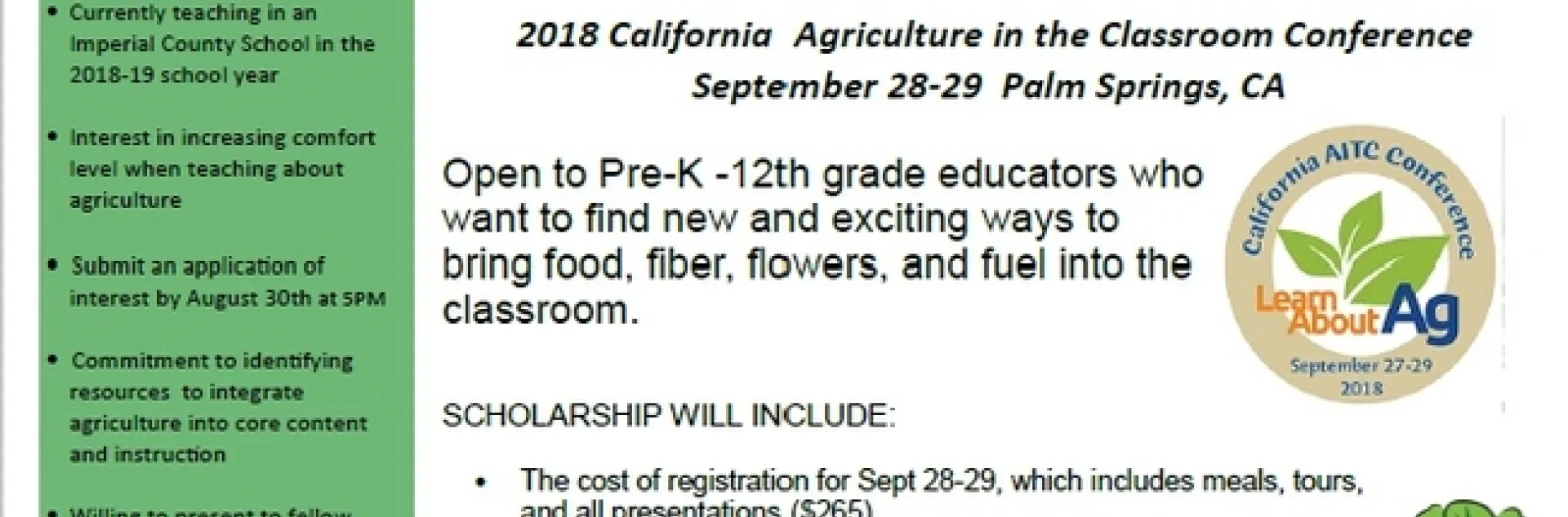 Have you been interested in finding new and exciting ways to bring food, fiber, flowers, and fuel into your learning environment? JOIN US for the 2018 California AG in the Classroom Conference. Through the generous donations of the Imperial County Farm Bureau, Imperial County Vegetable Growers Association, and Farm Credit Services Southwest there are a limited number of scholarships available to Imperial County Educators!