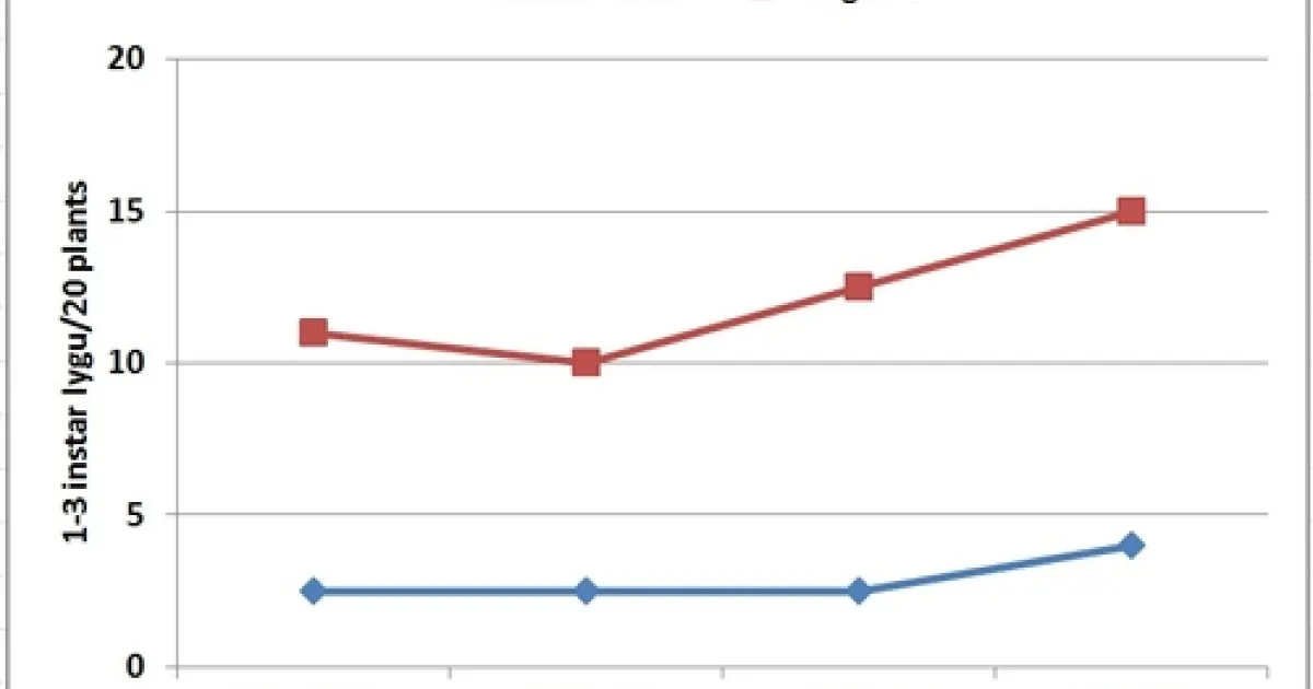 A higher number of lygus bugs were seen in the organic field than in the conventional field throughout the observation period. While the older nymphs and adults stayed at or below the treatment threshold, younger nymphs were consistently above the threshold (2.5 to 4 per 20 plants) in the conventional field. In the organic field, they were consistently above the treatment thresholds during the observation period.