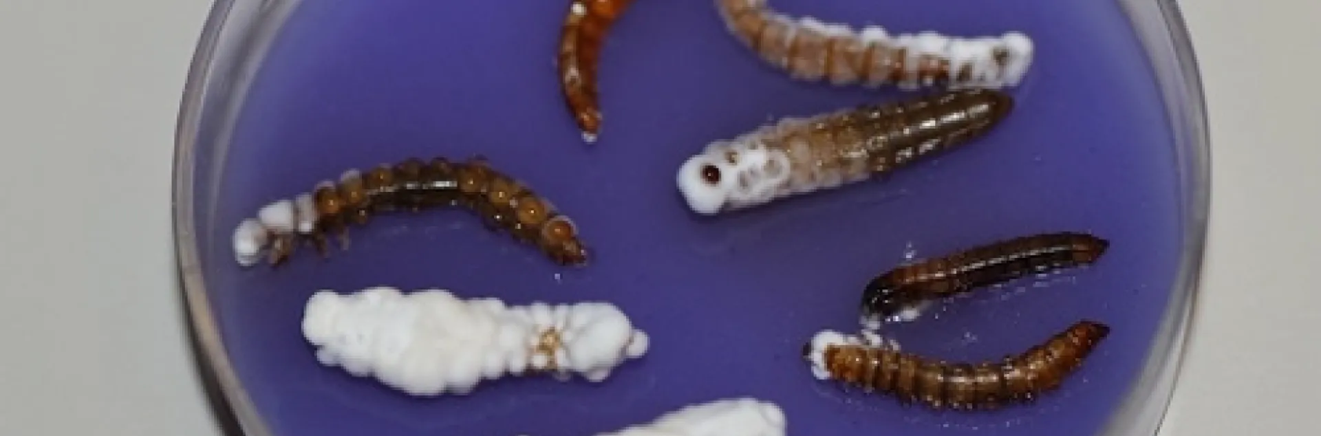 B. bassiana grows out of mealworms dead from infection. (Photo by Surendra Dara)
