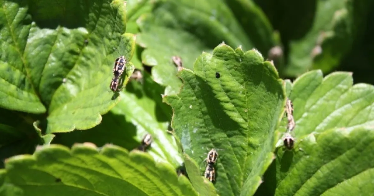 Bagrada bugs on strawberry foliage. Not seen to cause any feeding damage. (Photo by Jennifer Evangelista, San Luis Obispo)