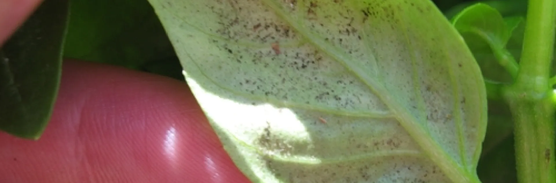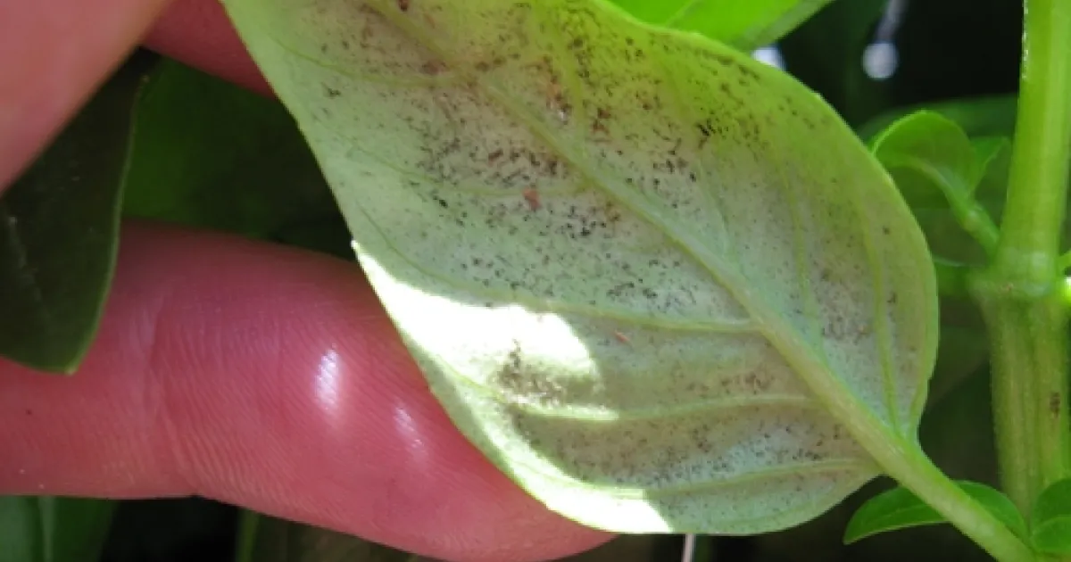 Fungal spores on the lowerside of the basil leaf (Photo by: Heather Scheck, Santa Barbara County Ag Commissioner Pathologist)