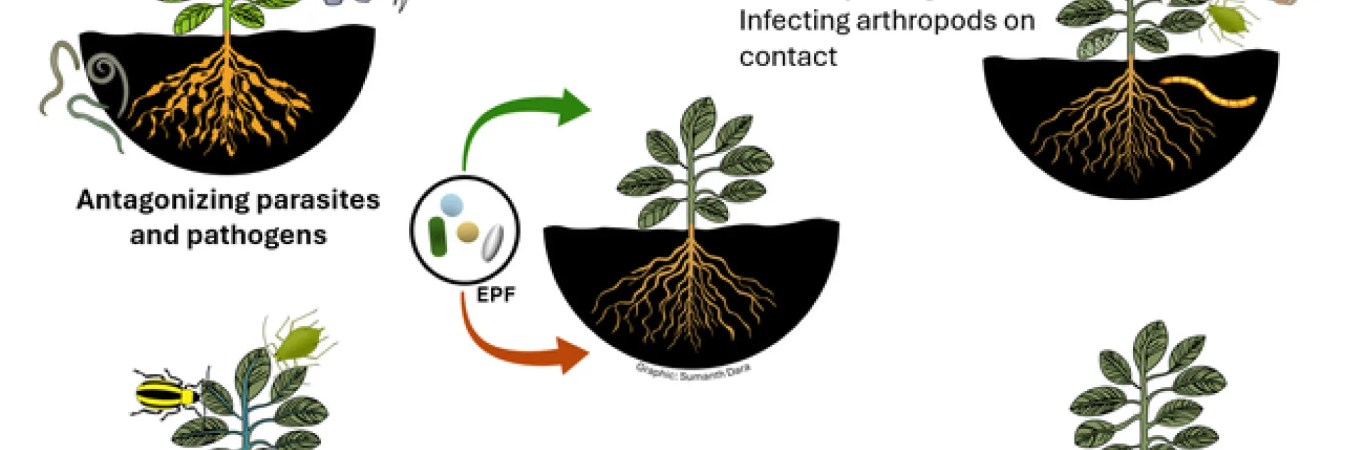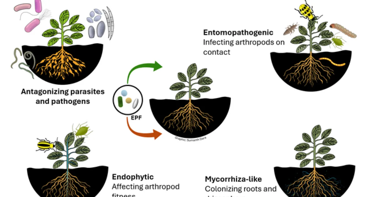 In addition to controlling arthropod pests, EPF being soilborne fungi also have a direct relationship with plants and other microbes. EPF colonize plant tissues and grow inside the plants in a phenomenon known as endophytism. Endophytic EPF grow as hyphae and do not produce spores. Although they cannot cause infection to pests feeding on those plants, they indirectly affect pests by reducing their fitness and survival by activating induced systemic resistance. When EPF are applied to soil, they form a mycorrhiza-like relationship with plant roots and help plants withstand biotic stresses and improve nutrient uptake. EPF can also antagonize plant pathogens through competitive displacement and antimicrobial activity. Thus soil and foliar application of EPF-based pesticides result in additional benefits in improving crop growth and health in addition to controlling pests through infection.