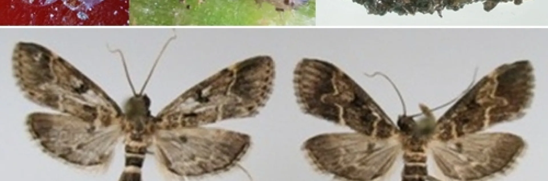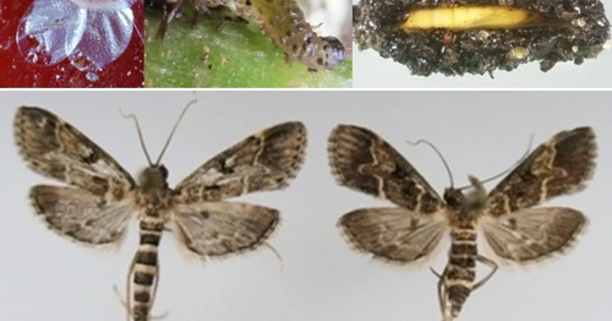 Life stages of the European pepper moth, Duponchelia fovealis.  Eggs (top left, photo credit: Lance Osborne, University of Florida), larva (top middle, photo credit: Bryan Vander Mey, UCCE), pupa in an opened cocoon (top right, photo credit: James Hayden, Florida Department of Agriculture and Consumer Services, Division of Plant Industry) and adult male (left) and female (right) moths (bottom, photo credit: James Hayden)