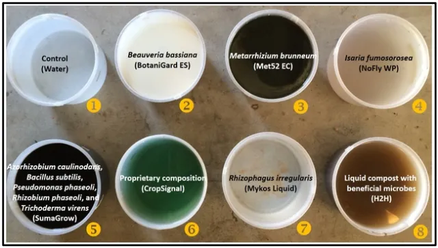 Plant survival: Beauveria bassiana was the only treatment where all the plants survived for 90 days of the observation period. There was a 10 to 80% mortality in other treatments during the observation period. Highest plant mortality was seen in SumaGrow and H2H treatments (P = 0.001 at 40 days after planting and