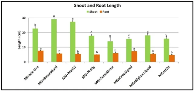 Shoot and root length: Plants treated with B. bassiana and M. brunneum had significantly (P < 0.00001) longer shoots than other treatments. Miracle-Gro-treated plants were shorter than those treated with these two entomopathogenic fungi, but longer than those in the remaining treatments. When root growth was compared, plants growing in Miracle-Gro alone and along with Crop Signal had significantly (P < 0.00001) longer roots than the rest.