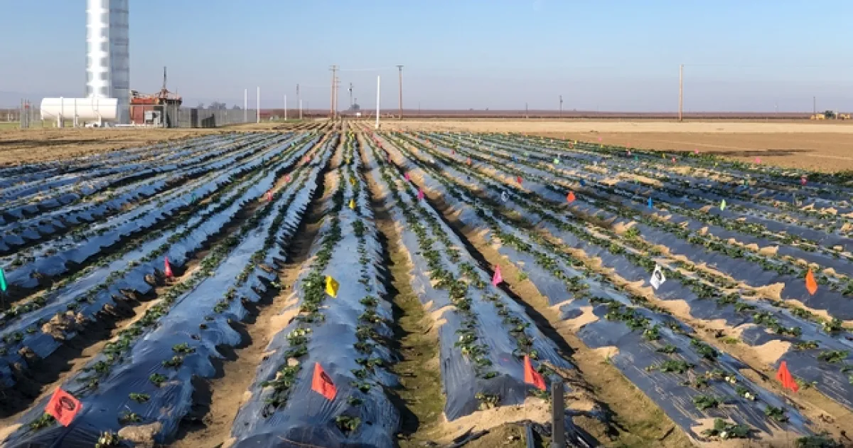 Strawberry, a high-value specialty crop in California, suffers from several soilborne, fruit, and foliar diseases. Verticillium wilt caused by Verticillium dahliae, Fusarium wilt caused by Fusarium oxysporum f. sp. fragariae, and Macrophomina crown rot or charcoal rot caused by Macrophomina phaseolina are major soilborne diseases that cause significant losses without proper control. Chemical fumigation, crop rotation with broccoli, nutrient and irrigation management to minimize plant stress, and non-chemical soil disinfestation are usual control strategies for these diseases. Botrytis fruit rot or gray mold caused by Botrytis cineaea is a common fruit disease requiring frequent fungicidal applications. Propagules of gray mold fungus survive in the soil and infect flowers and fruits. A study was conducted to evaluate the impact of drip application of various fungicides on improving strawberry health and enhancing fruit yields.