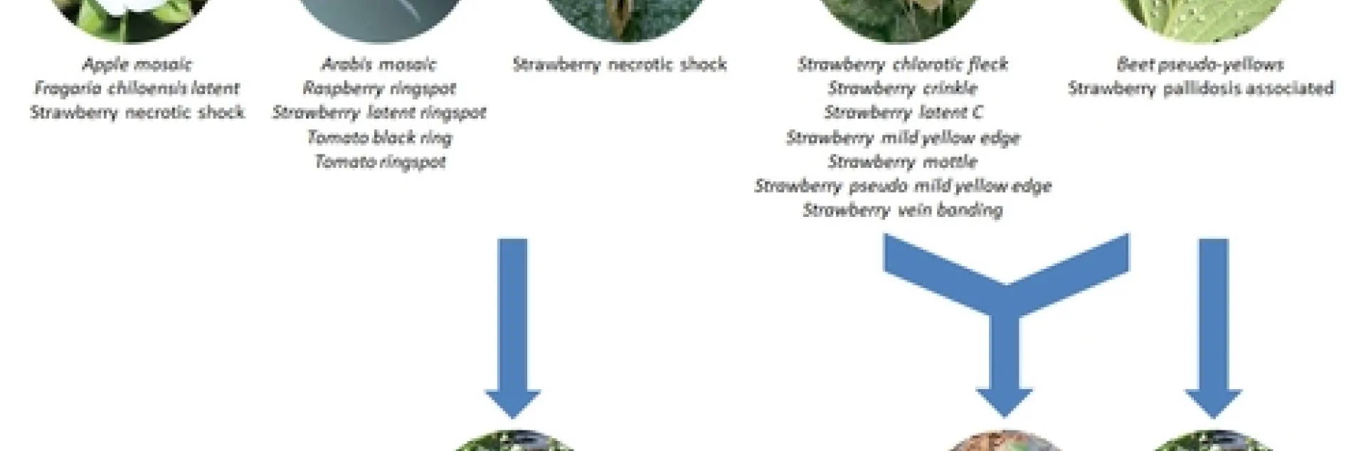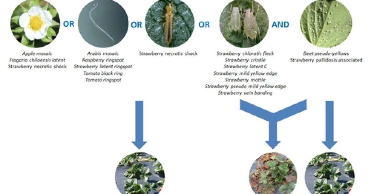 Nematodes are controlled by fumigation and are not a pest in strawberries, in general.  Various species of aphids occur at low numbers in California strawberry fields and usually do not require targeted treatments.  However, increased whitefly infestations on newly planted strawberries coupled with aphids and pollen transmitted by multiple partner viruses probably contributed to this new problem.