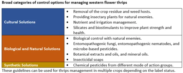 Integrated pest management approach is critical for successful pest management. It involves regular monitoring, exploring the potential of multiple options including cultural and biological solutions, and proper timing and application of various strategies among others. The western flower thrips is one of the pests where insecticide resistance is a common problem. To reduce the risk of resistance development, it is necessary to explore the potential of multiple control options and rotate insecticides with different modes of action. This is essential to suppress pest populations to desired levels and also to maintain control efficacy of existing pesticides.