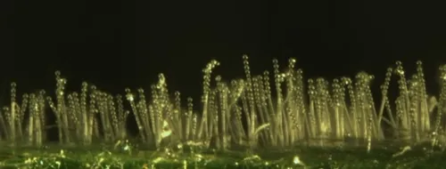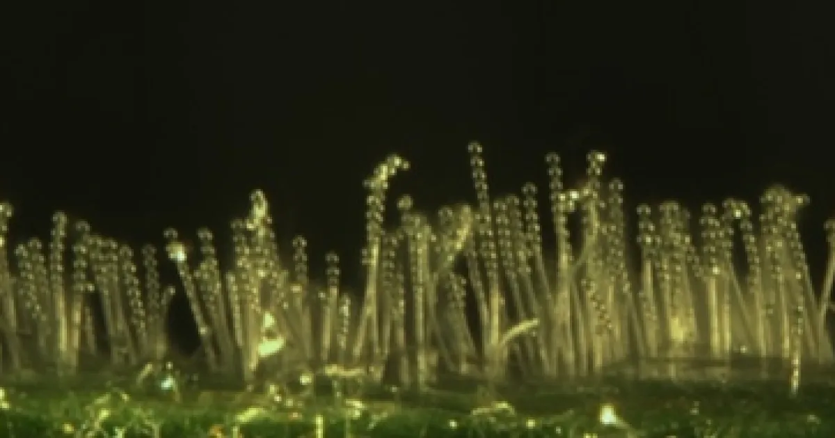 Conidial chains borne atop conidiophores. It is these stalk-like conidiophores that give mildew colonies their powdery appearance. Spores form at the bottom of the chain, so the oldest spores are at the tip of the chain. They break off in wind currents and can travel short distances, generally less than 100 meters. (Photo and description by David Gadoury, Cornell University)