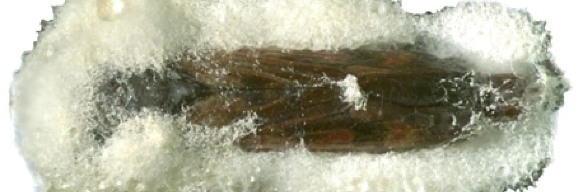 Bagrada bugs (above) and the glassy-winged sharpshooter (below) killed by Beauveria bassiana. Fungus emerges from the insect cadaver and produces spores which can continue the infection process. (Photos by Surendra Dara)