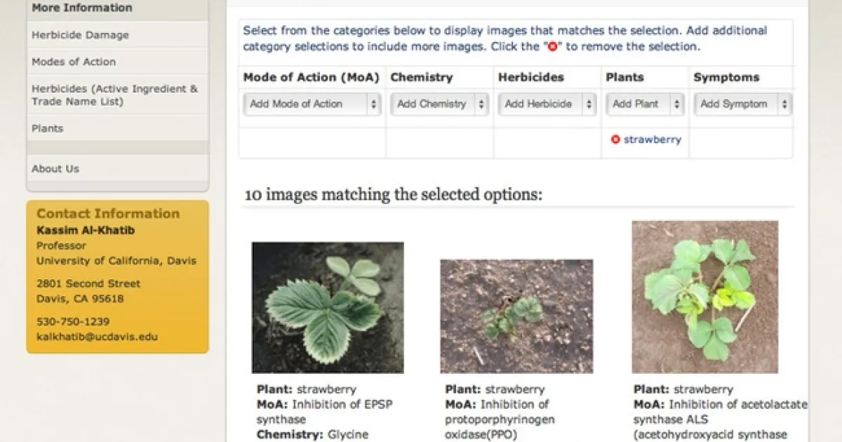 Dr. Kassim Al-Khatib, weed science professor at UC Davis and director of the UC Statewide Integrated Pest Management Program (UC IPM), has gathered nearly a thousand photos of herbicide-damaged plants, drawn from his own and others' research. The images are cataloged to show damage that can occur from 81 herbicides in more than 14 specific herbicide modes of action, applied in the field to demonstrate the symptoms or when known herbicide spray has drifted onto the plant.