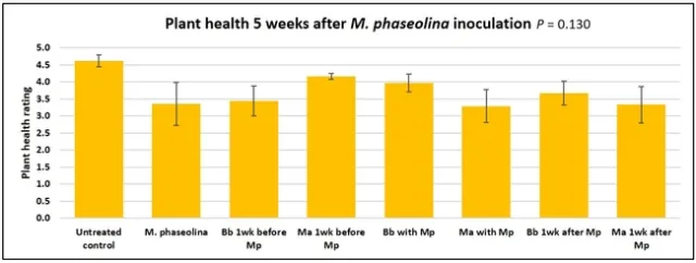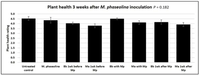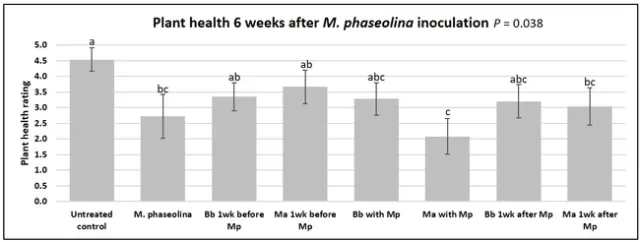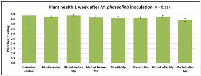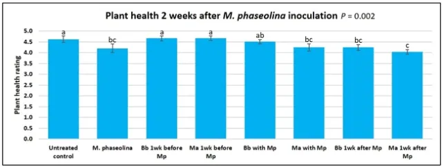 When data from different treatments for each entomopathogenic fungus were compared, both B. bassiana and M. anisopliae s.l. appeared to reduce the wilting, but the plant health rating was not significantly different from the M. phaseolina treatment alone.