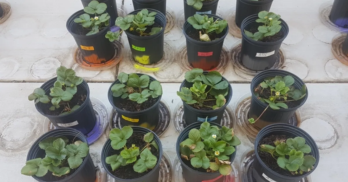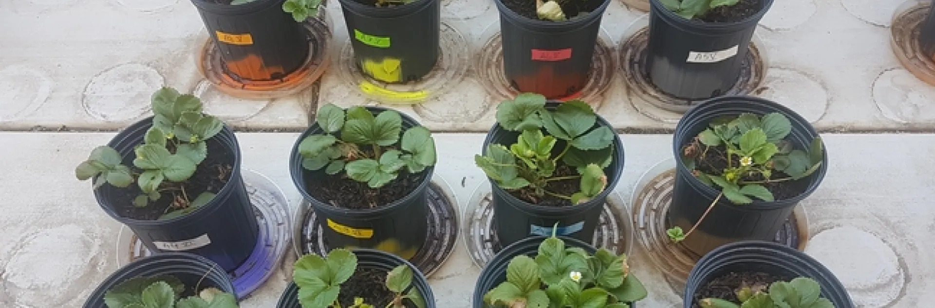Potted strawberry plants color-coded for different treatments. Photo by Surendra Dara