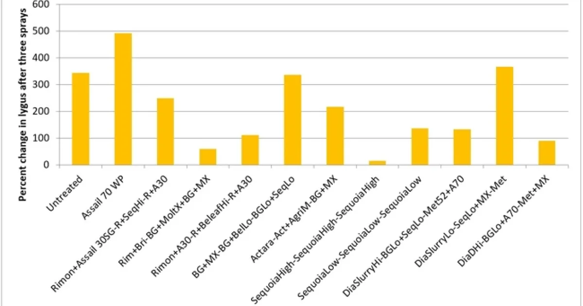 Lygus bug: Lygus numbers increased in all treatments after treatment and there were no statistical differences (P > 0.05). However, when the percent change, compared to pre-treatment counts, was considered, some treatments appeared to be more effective than others in preventing population buildup. The high rate of Sequoia (treatment 8) limited the increase to 14% followed by the rotation of Diafil high rate-BotaniGard low rate+Assail 70 WP-Met 52+Molt-X (treatment 12) indicating the potential of non-chemical alternatives for lygus bug management (Table 4). When BotaniGard+Molt-X combination was applied twice after Rimon+Brigade combination (treatment 4), it appeared to be the fourth best rotation limiting the population build up to 54%. Untreated control and Assail 70 WP had the highest lygus numbers with 383% and 1083% increase, respectively.