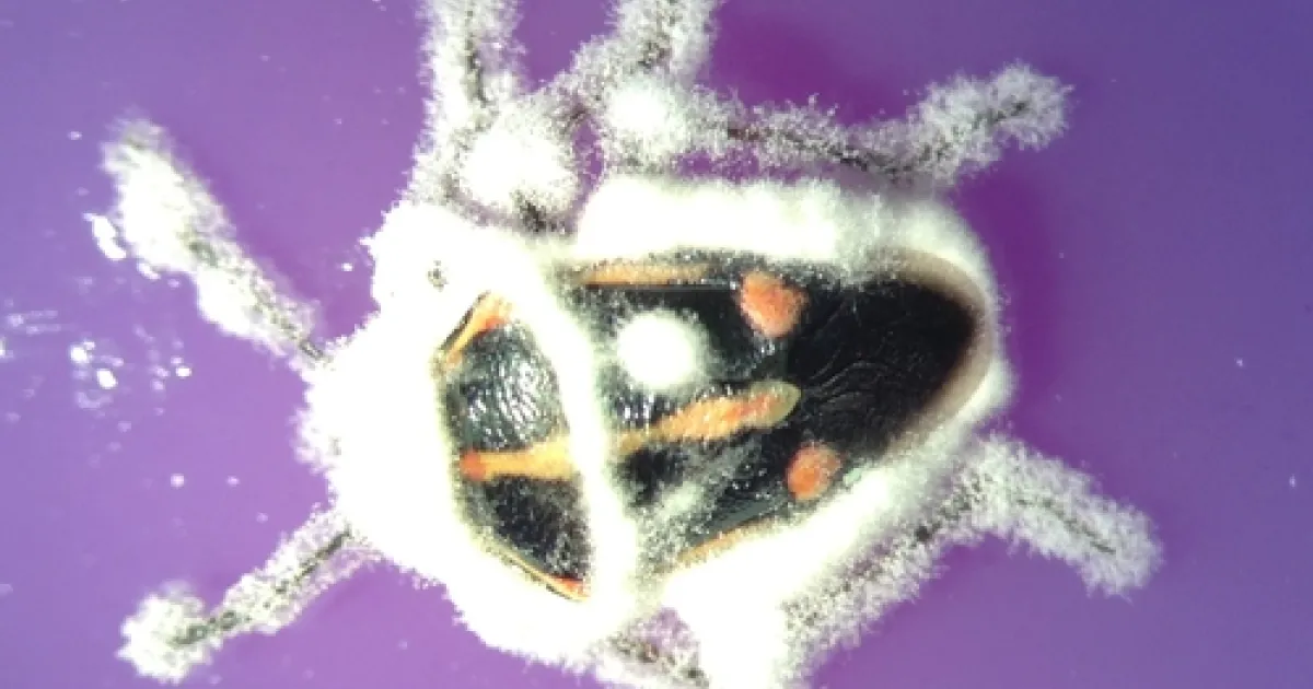 Bagrada bug adults infected and killed by commercially available formulations of three insect pathogenic fungi.  Fungal spores penetrate the insect, spread through the body, kill the insect, and emerge from the cadaver producing more spores.