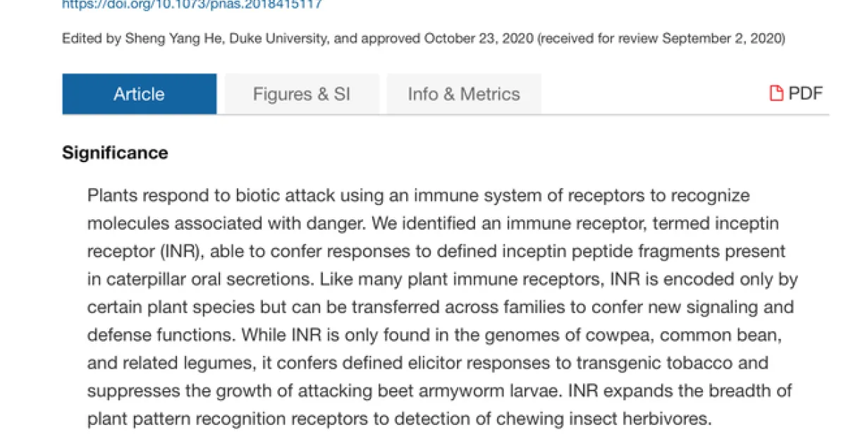 Steinbrenner served as the lead author of a paper published Nov. 23, 2021 in the Proceedings of the National Academy of Sciences on how cowpea plants detect that they're being eaten by caterpillars. In the article, A Receptor-Like Protein Mediates Plant Immune Responses to Herbivore-Associated Molecular Patterns, scientists from the University of Washington and UC San Diego reported that the cowpea plants harbor receptors on the surface of their cells that can detect a compound in caterpillar saliva and initiate anti-herbivore defenses.