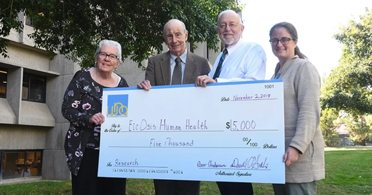 Anderson and WNA treasurer Darrell O'Sullivan, a former lab manager at the UC Davis Medical Center, recently visited the Hammock lab to present a $5000 check from the association to EicOsis, the Davis company that Hammock founded to move inhibitors of the soluble epoxide hydrolase into human clinical trials.
