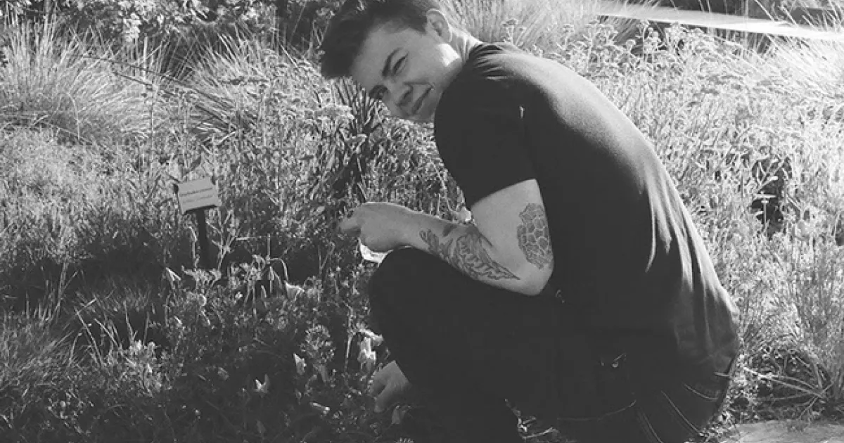 Microbiologist Shawn Christensen scoping out California golden poppies at the UC Davis Arboretum to take into his lab for experiments. Yes, Shawn says, the tattoo is of pollen grain. (Photo by Benjamin Van Domelen)