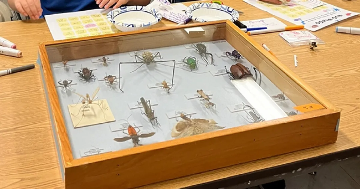 Each student also "invented" a bug, pinned it with toothpicks, and labeled it. Edwards and Lippey also shared insect collections borrowed from the Bohart Museum of Entomology, home of eight million insect specimens.