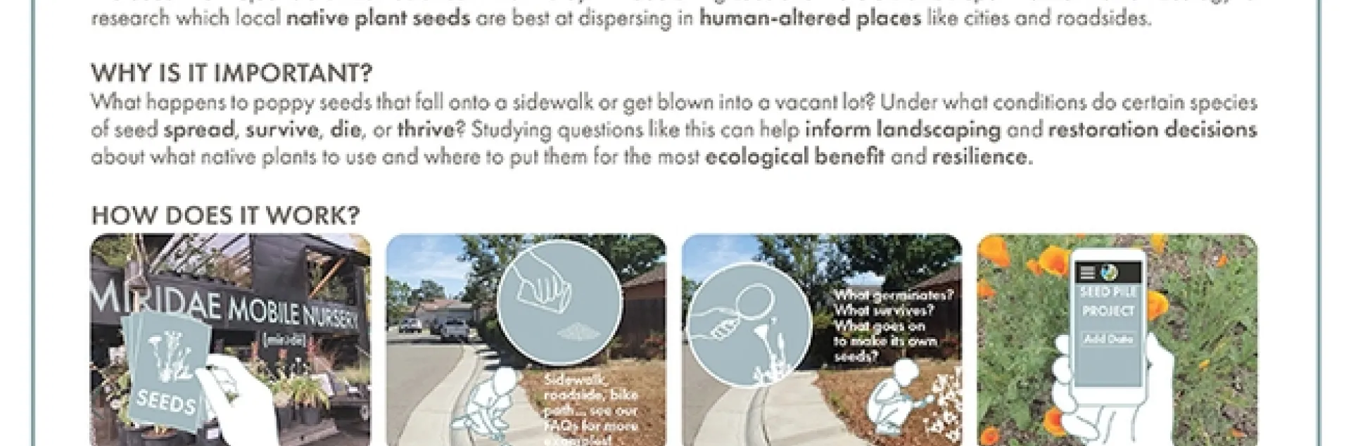 It works like this: "Community participants to drop small piles of local, California native seeds in urban areas where they live or work, then monitor the results through repeated observations," Krimmel said. "Using data from participants on the conditions under which certain species of these locally adapted seeds spread, survive, or die, we can gain a better understanding of which native species to incorporate into the built environment and where to put them for the greatest ecological benefit and resilience."