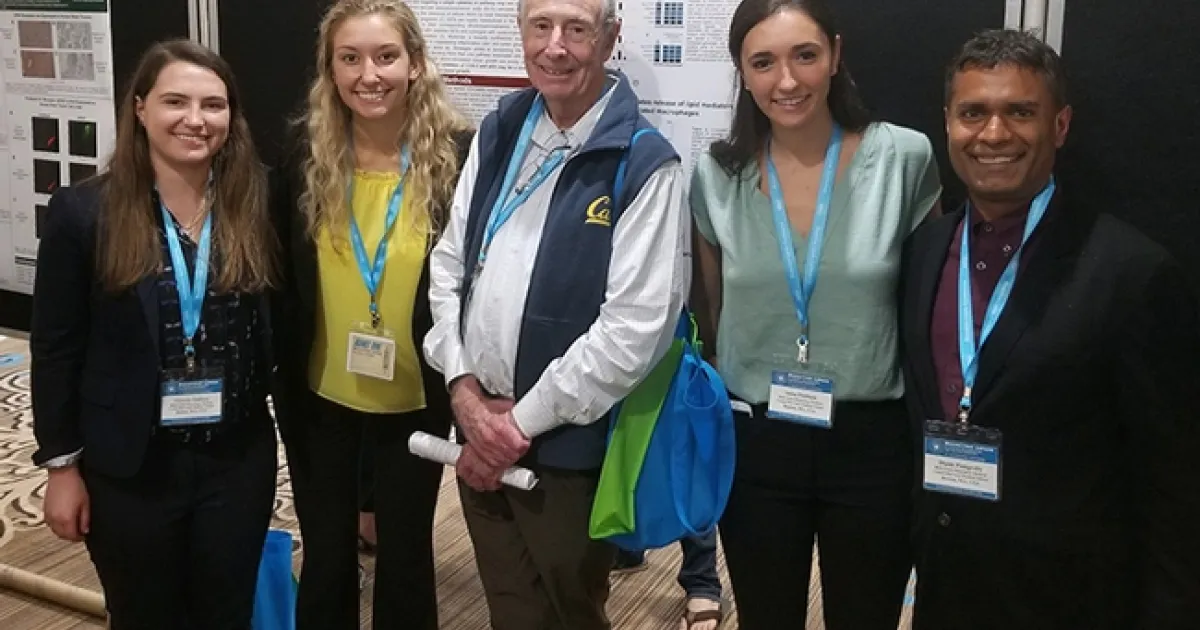 Collaborators who presented their research at the 2019 Bioactive Lipid meeting in St. Petersburg, Fla., included Bruce Hammock of UC Davis and scientists from the lab of physician-researcher Dipak Panigrahy, Harvard Medical School. From left are Tori Hallisey, Kelsey Kendzulak, Bruce Hammock, Anna Fishbein and Dipak Panigrahy.