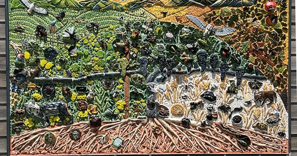 “Students had the opportunity to hear about integrated pest management from Steve Matthiasson, and to consider the role of insects as pests and as natural enemies, in the context of all the other life in the vineyard,” Ullman said. “What a great experience! Emily Meineke and I are incredibly grateful to our partner in design and fabrication of the mural, Gale Okumura, a retired lecturer from the Department of Design, and the many community members and volunteers who helped make this mural possible. The installation is unusual in that the mural is mounted inside a frame that is attached to wall, rather than being attached directly to the wall. The engineering and building of this system, as well as the installation, was done by artist Amanda Larson of Half Moon Bay. Amanda has Davis connections as she grew up here and has a master's degree from California College of the Arts in San Francisco. We were delighted to be given this opportunity by the Matthiassons. The mural really celebrates their commitment to biodiversity and sustainability in viticulture.”