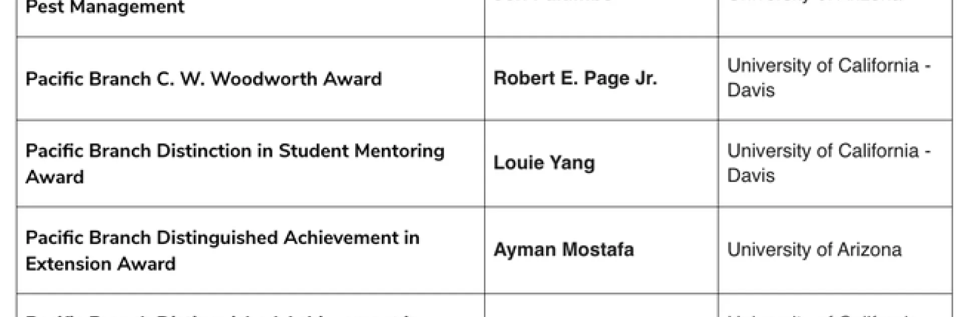Honey bee geneticist Robert E. Page Jr. won the top award, the C. W. Woodworth Award. (See news story). He is the 12th UC Davis entomologist to win the award, first presented in 1969. Previous UC Davis recipients: