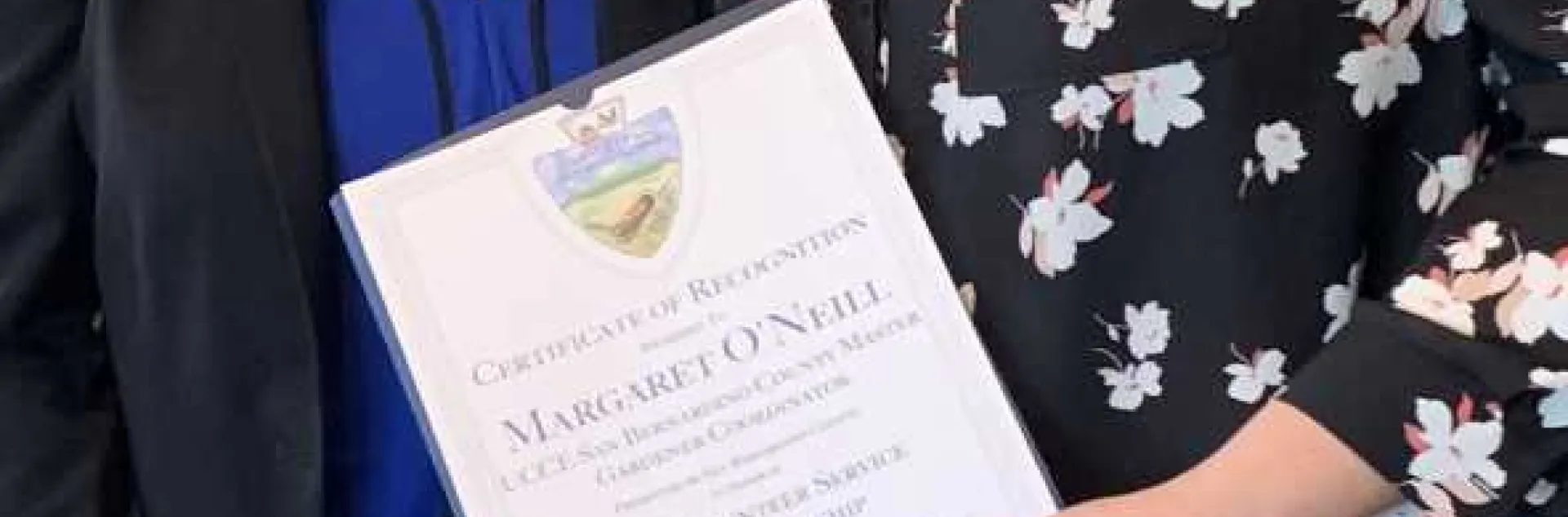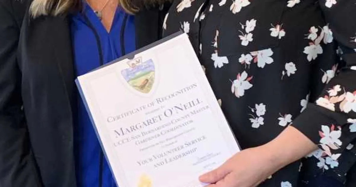 UCCE Master Gardener Coordinator for San Bernardino County Maggie O'Neil received a much deserved Certificate of Recognition from San Bernardino County Supervisor Dawn Rowe at the April 16, 2019 Farm Bureau meeting. Supervisor Rowe's Chief of Staff Gayle Covey (left) is pictured below with Maggie.
