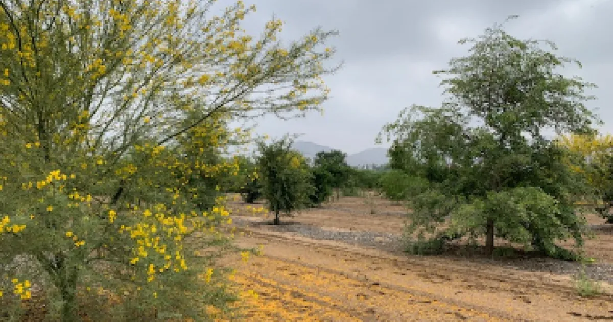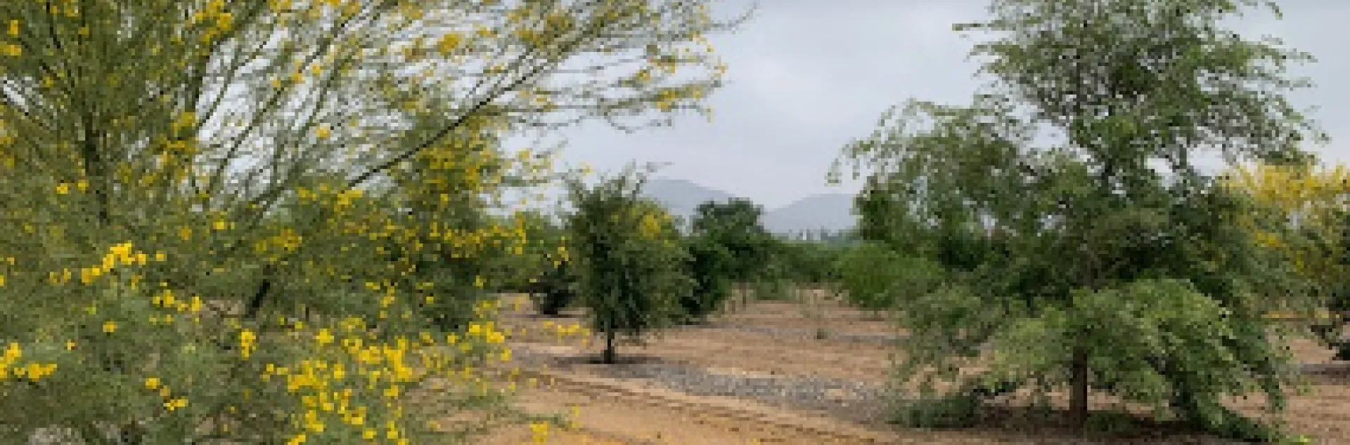 A dry, sandy landscape with scattered trees, one covered in small yellow flowers, under a cloudy gray sky.