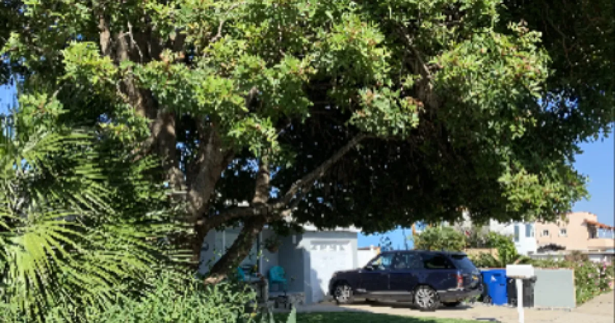 A black minivan parked under a large leafy tree beside a small white building, with greenery and blue trash bins visible on a sunny day. - Building climate-resilient communities and ecosystems