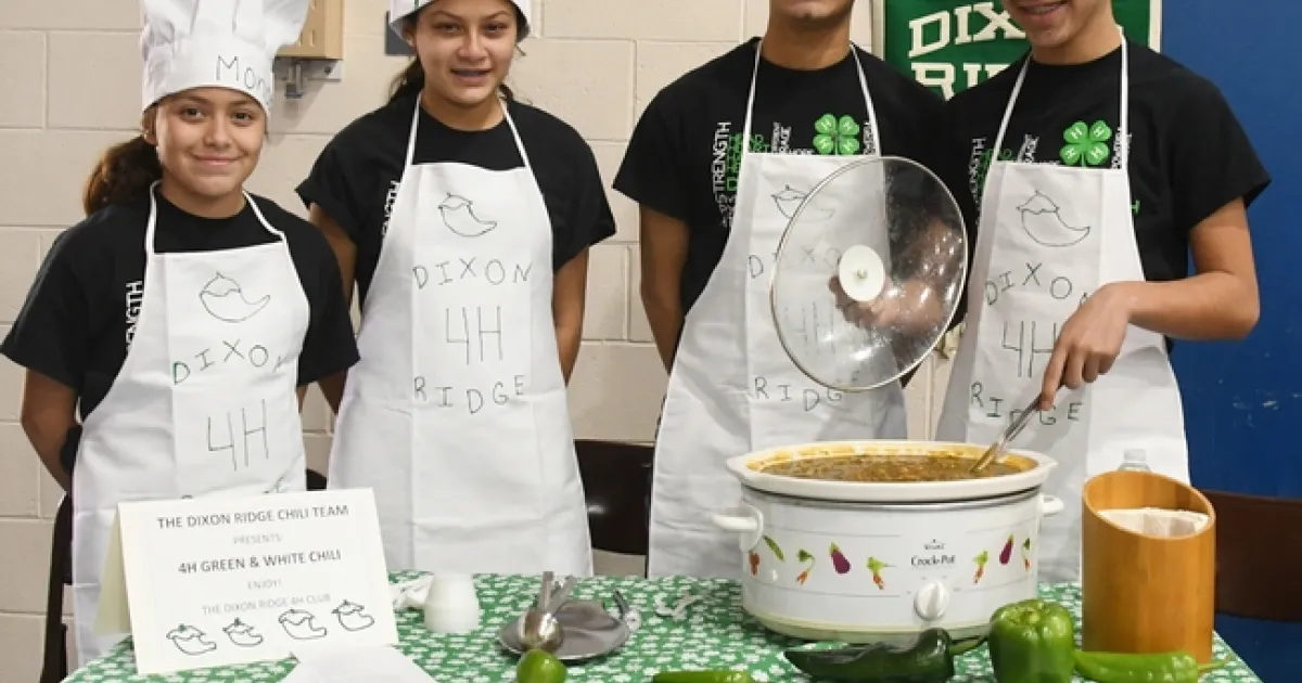 The Dixon Ridge team competed against Team Delta of the Rio Vista 4-H Club, which prepared “Chili-licious”; Hillbilly Chili Team from Tremont 4-H Club, Dixon, “Hillbilly Chili”; Lil' Peppers Team from the Pleasants Valley 4-H Club, “Chicken Enchilada Chili” (the team won last year's competition); and Team Minecraft of the Sherwood Forest 4-H Club, Vallejo, which prepared “Ruby Redstone Chili.”