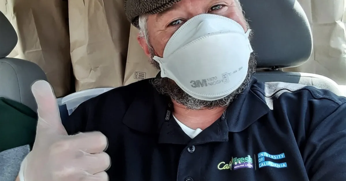 During the pandemic, CalFresh Healthy Living, UC supervisor Tuline Baykal and community educators Max Fairbee and Leticia Christian continue to provide nutrition information to community members, inserting into food bags recipes, nutrition information and exercises that can be done at home. Max Fairbee, CalFresh Healthy Living, UC educator has also volunteered to deliver food bags to residents at a senior housing site.