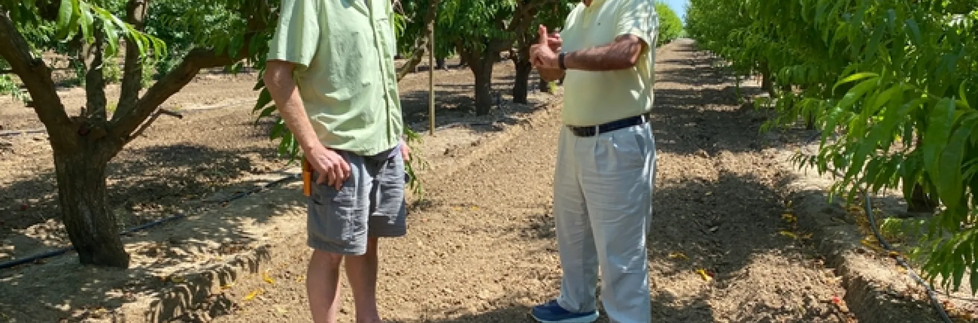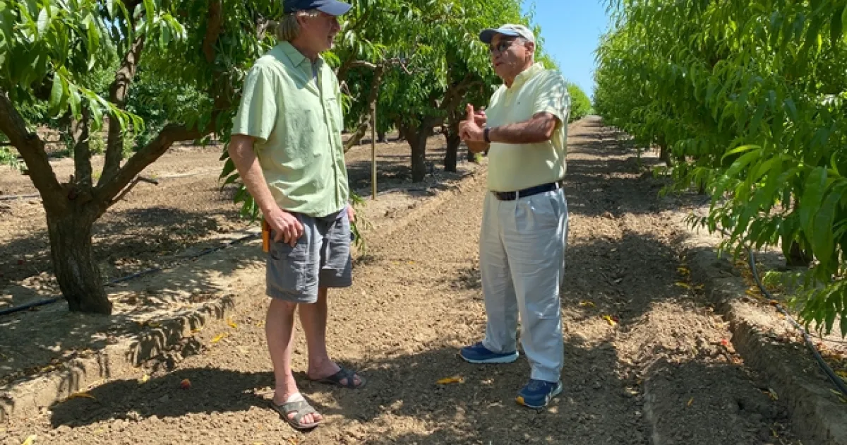 In an experimental orchard a few miles west of the UC Davis campus, Thomas Gradziel plucked a nearly ripe nectarine from one of the trees. He whipped out a pocketknife and sliced off juicy chunks for Carlos Crisosto to taste. Both are orchard crops experts in the UC Davis Department of Plant Sciences, and both love peaches.