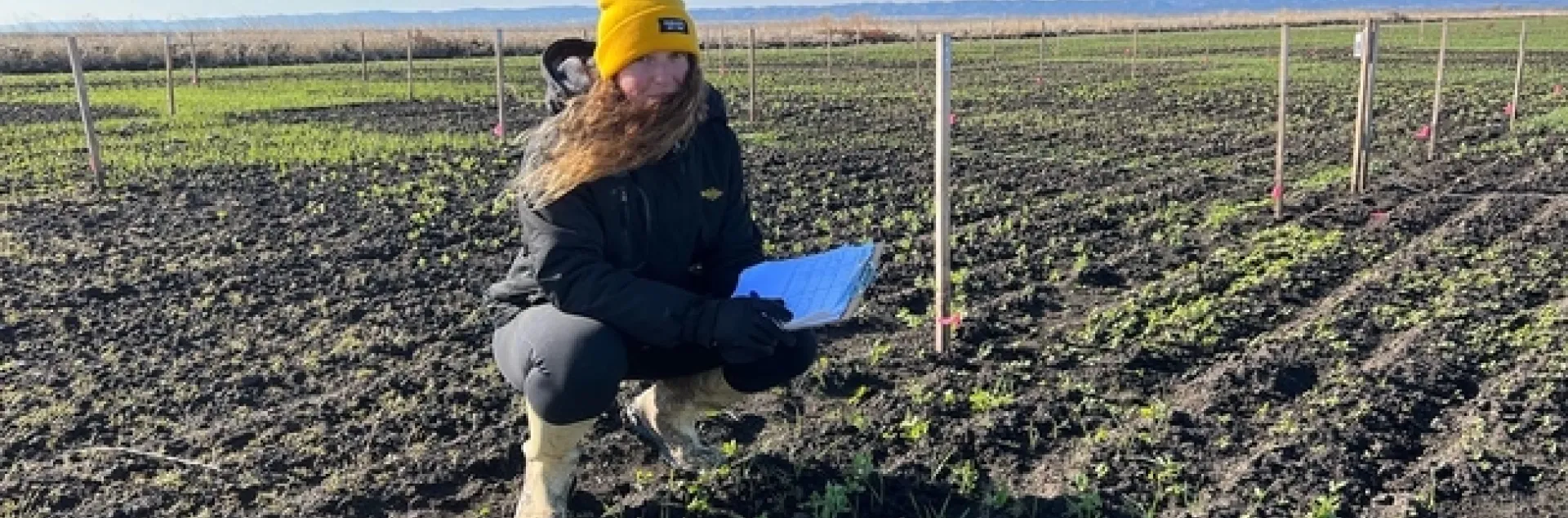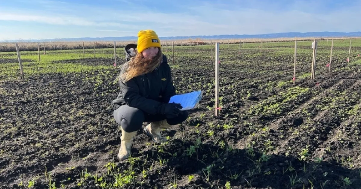 PhD candidate Sara Rosenberg collects seed emergence data of cover crop mixtures at the Colusa Farm research site