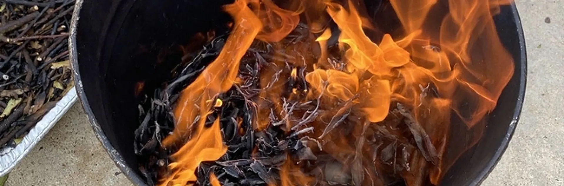 Images show (A) controlled burning of plant material, (B) dried-unburned plant material before and (C) after packed in mesh bags, (D) visual differences in water quality between tanks receiving high (left) and low (right) amounts of plant detritus and (E) the experimental pond array at the UC San Diego Biology Field Station. Photo credit: C.Wall