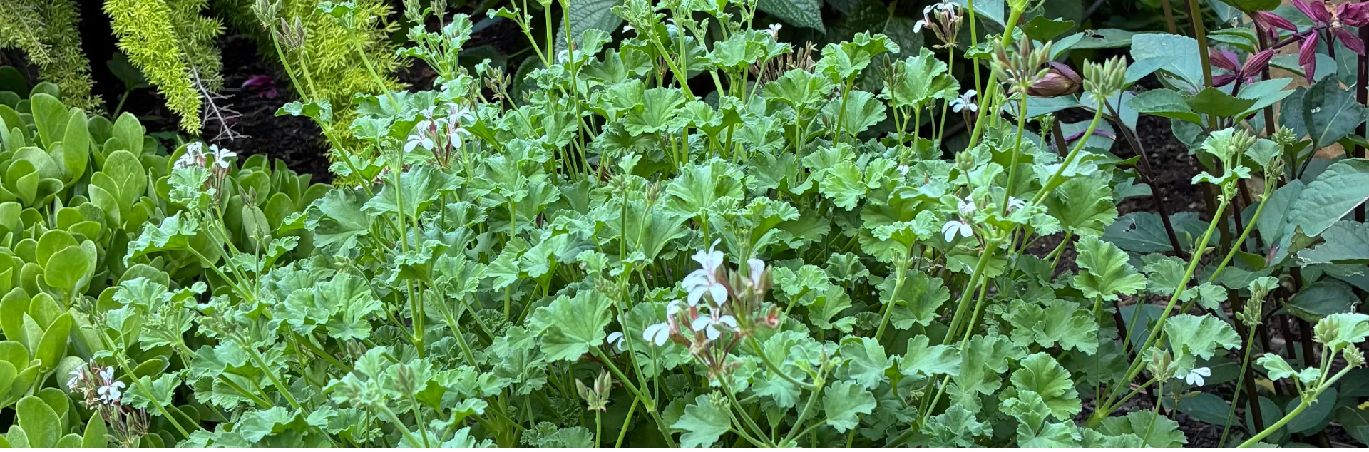 The ever-popular scented geraniums, mostly coming from South Africa, do exceptionally well in our climate. But when planted in a perennial border, many will grow 3 to 4 feet tall and can become quite leggy. An exception to this is the nutmeg-scented geranium, Pelargonium x fragrans. Reaching only 18 x 18 inches, it stays very dense and compact, needing very little maintenance. The foliage is gray-green and deeply lobed with an interesting, crinkled appearance. When brushed or rubbed, it gives off a subtle nutmeg fragrance. Place it near the front of a bed where the fragrance and almost year-round dainty white flowers can be appreciated. It’s also an excellent filler plant in a mixed container.