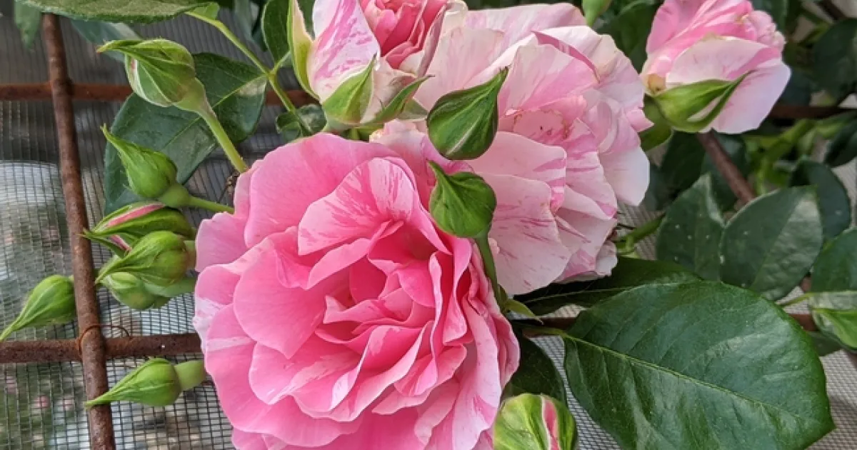 Earlier in the article, I showed you a climbing rose that had been pruned. Here is what it looks like in the spring. This rose, called Flamingo Dancer, is one gorgeous rose that tolerates our soil and weather conditions beautifully. It also makes a lot of hips in the fall (great for tea if you don't use insecticides). Because it's a semi-double flower rose, the bees find it irresistible. It's great for our pollinators! Flamingo Dancer was bred by Burling Leong, who has her own nursery in Visalia, Calif. Burling has bred several amazing roses. Her nursery is a beautiful place to visit. She worked for many, many years for the famous rose breeder Ralph Moore (whose nursery was also in Visalia).