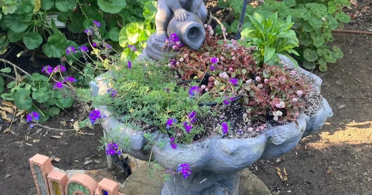 - Trees, shrubs, vines: violet trumpet vine (Clytostoma), Indian hawthorn (Rhaphiolepis).