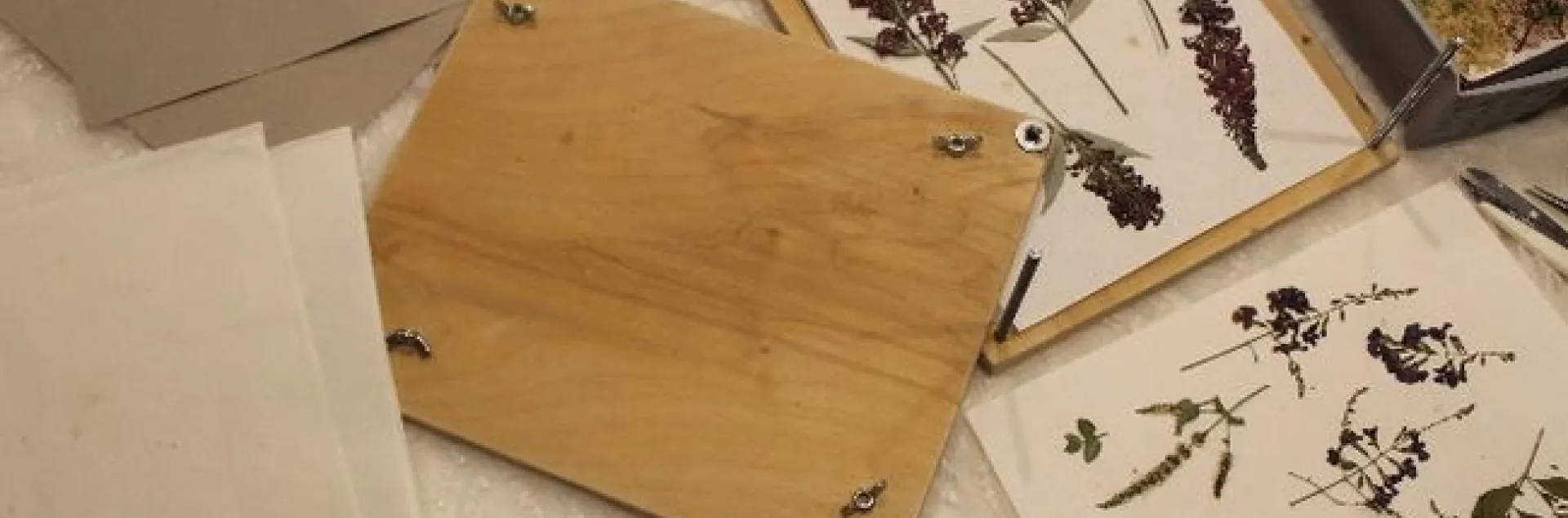 2. Flower press. You can purchase one or make your own. When making your own flower press, you will need two pieces of strong, flat wood with a ¼” hole drilled in each corner, four ¼” bolts (about 3” to 4” long) with washers and wingnuts to fit. Wood pieces approximately 10” x 12” (good for 8 ½” x 11” paper) are best, but you can make them whatever size works best for you.