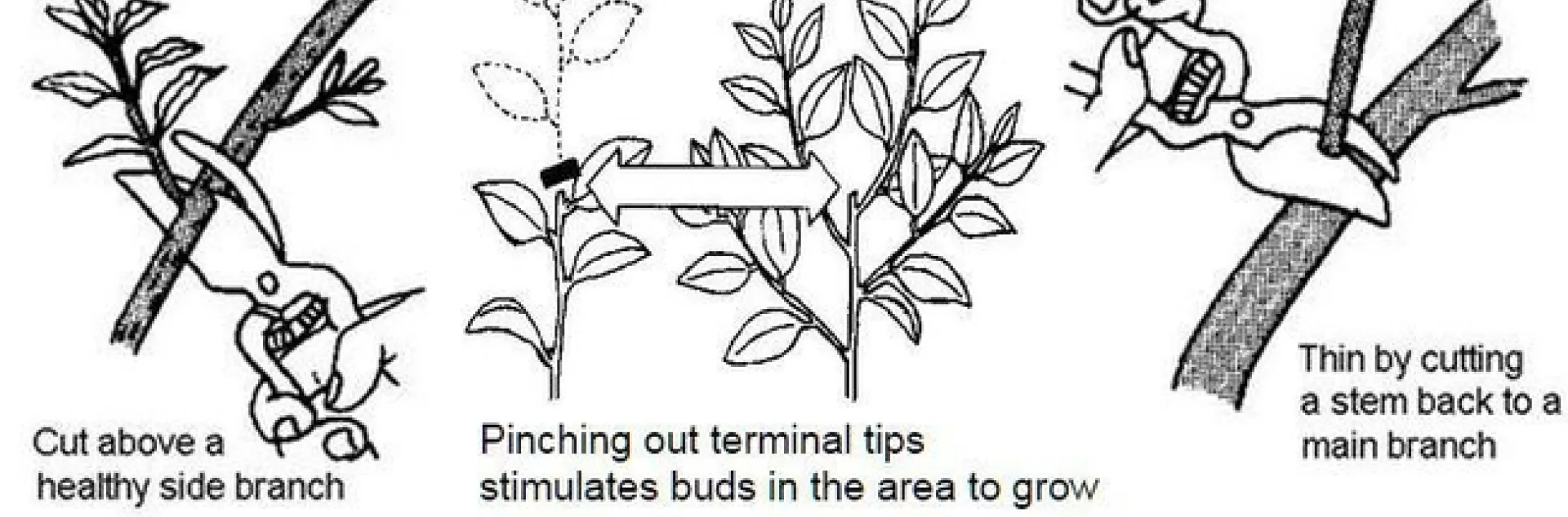 Fifth Rule: Don't be afraid to prune at any time for diseased, dead, broken or crossing branches, or stray branches whose removal could improve the appearance of your shrub. For more information on pruning, go to: https://dyckarboretum.org/pruning-guide/. It is also possible to keep fruit trees at a lower height by summer pruning which decreases vigor. For more information on summer pruning and training of fruit trees see: http://homeorchard.ucdavis.edu/8057pdf