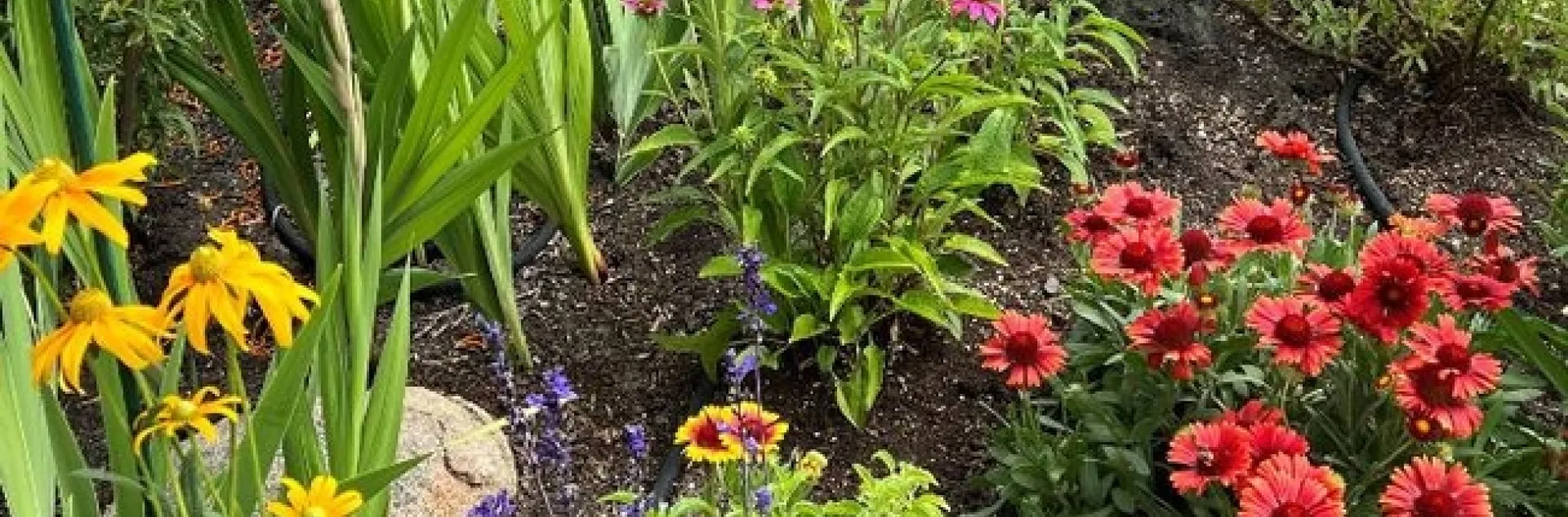 Other perennials can be added to these long blooming choices to add interest, even if they bloom for shorter periods. The Demonstration Flower Garden has daffodil, bearded iris, day lily, and gladiola bulbs, which bloom in succession from early spring to early summer, as well as Canna Lily and Shasta Daisy and two roses. Victoria Blue Salvia provides cool blue color against the yellow yarrow (while technically an annual, this salvia has continued to thrive for the last three years in the Demonstration Garden). In spring, we add a variety of annual zinnias, which add color from late spring to fall, and are excellent for pollinators and birds.